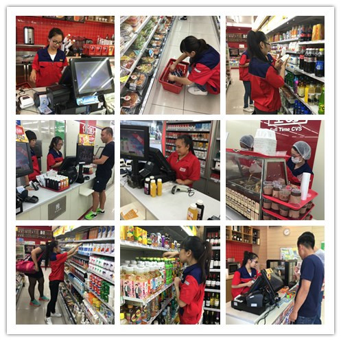 下图为全时叁陆伍连锁便利店的实习生,小编巡店时看到同学们热情洋溢的在各自的门店进行促销商品、收银和理货的工作。